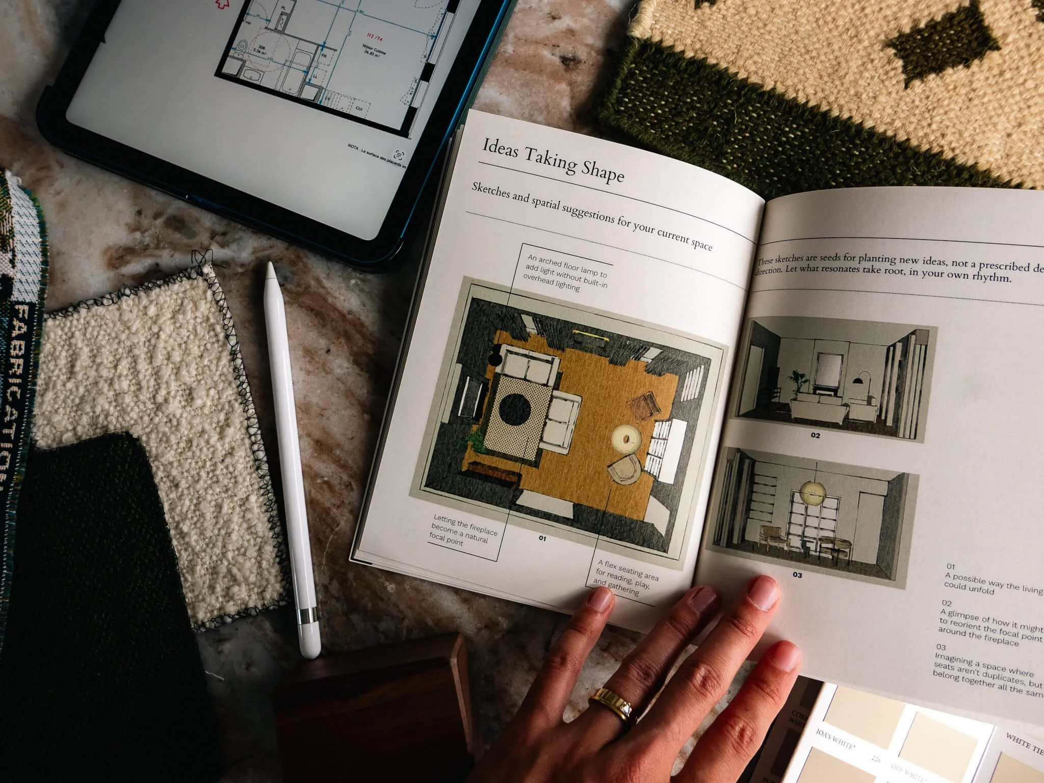 You'll leave with a personalized printed guide — a tangible reference that gathers your color palette, materials, and intuitive direction for sourcing and styling over time.